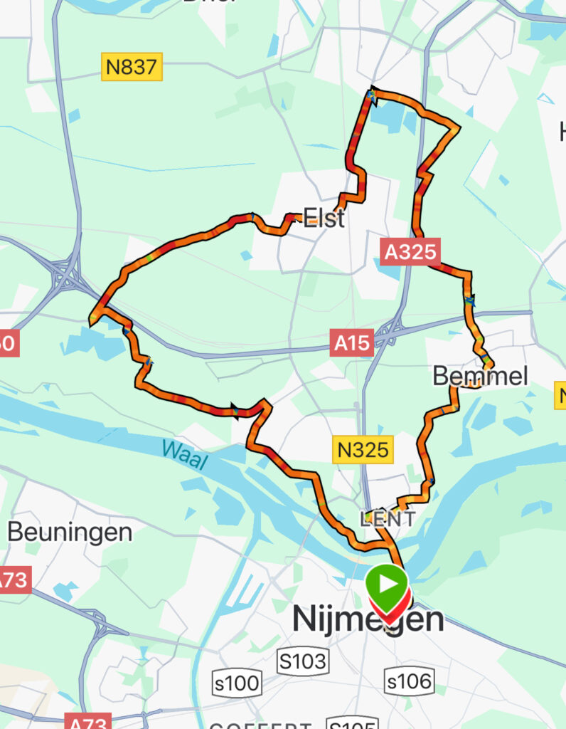 Onder luid applaus, gezang en de vele high fives van de toeschouwers, die de hele nacht gefeest hadden, vertrokken we over de Waalbrug naar Elst!